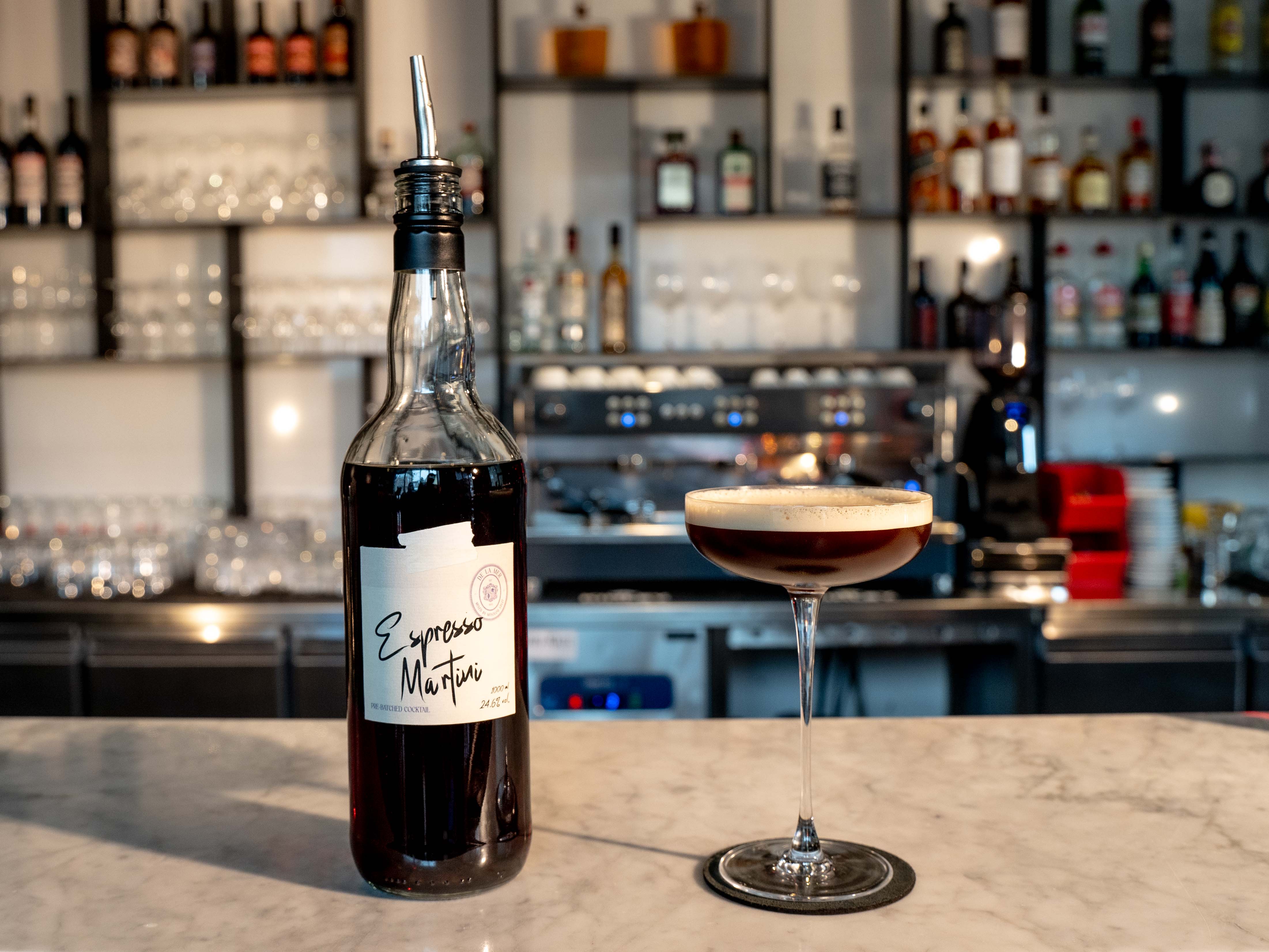 Pour the pre-mixed Espresso Martini and one shot of freshly brewed, fully cooled espresso into a shaker filled with ice. Shake vigorously until well-chilled and a fine crema forms, then strain into a chilled coupe or martini glass. Finish by placing three coffee beans on top of the foam.
